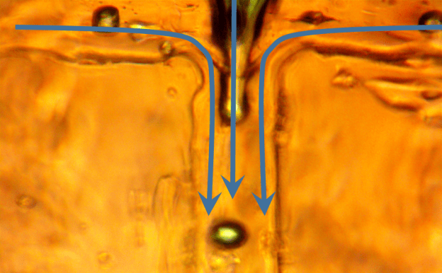 I haven’t started flowing things through the prism yet. I’m still figuring out how to detect the angle change. But there definitely is an angle change. I can see the difference in angle between when I have air in the prism and when I have water in the prism. Have a look – that’s air on the left and water on the right:
