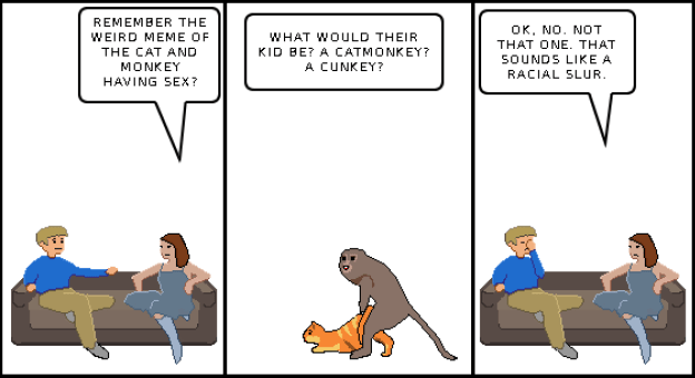 This comic is a depiction of actual events. My dear wife says the most hilarious things. I (regretfully) knew exactly what meme she was talking about. I also agree that the term she made up definitely sounds like a racial slur. We started talking about what it was a racial slur for, but discovered that was a terrible conversation and that we needed to stop.