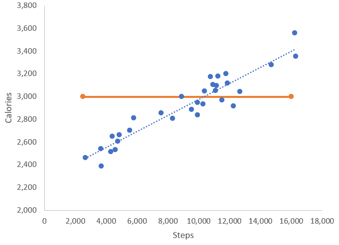 Here’s how that could work. I could set a goal for 3000 calories. In general (using data from December), when I have burned 3000 calories I have also walked 10,000 steps (see graph). I imagine that the fitbit calculates calories from height, weight, steps, and heart rate data. So setting the goal in terms of calories means that I will either have to walk as usual or I will need to do other things to keep my heart rate up (like pushups, sit-ups, etc).