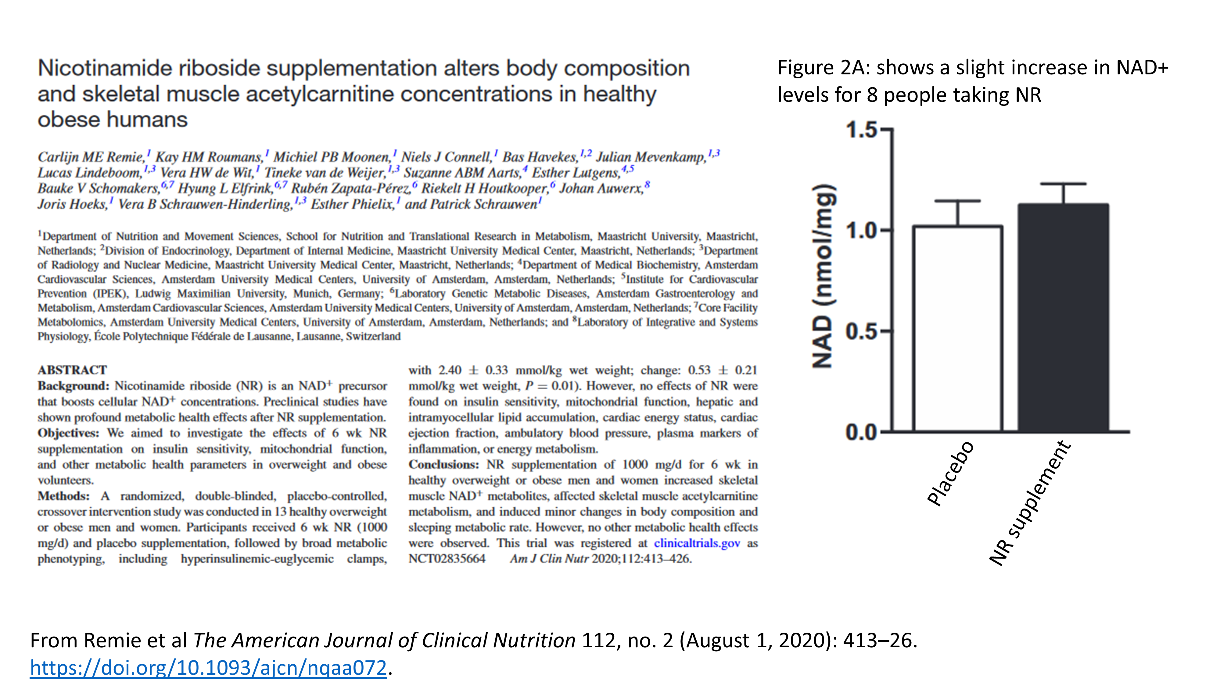 Remie, Carlijn M E, Kay H M Roumans, Michiel P B Moonen, Niels J Connell, Bas Havekes, Julian Mevenkamp, Lucas Lindeboom, et al. “Nicotinamide Riboside Supplementation Alters Body Composition and Skeletal Muscle Acetylcarnitine Concentrations in Healthy Obese Humans.” The American Journal of Clinical Nutrition 112, no. 2 (August 1, 2020): 413–26. https://doi.org/10.1093/ajcn/nqaa072.