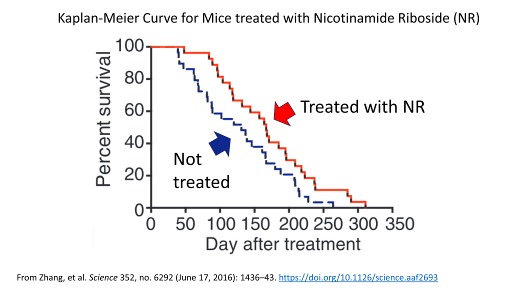In the referenced study in mice, the KM curve for NMN showed a modest benefit, the treated mice got a little boost. The mice receiving NMN did not achieve immortality or even double their lifespan. But it’s better than nothing. The average mouse lived maybe a month longer. That’s pretty significant. They only live about 3 years. If it scales up, and people get the same benefit, that might be like a person getting six more year of life. Of course, that’s the big question, right? Does it apply the same way in humans?