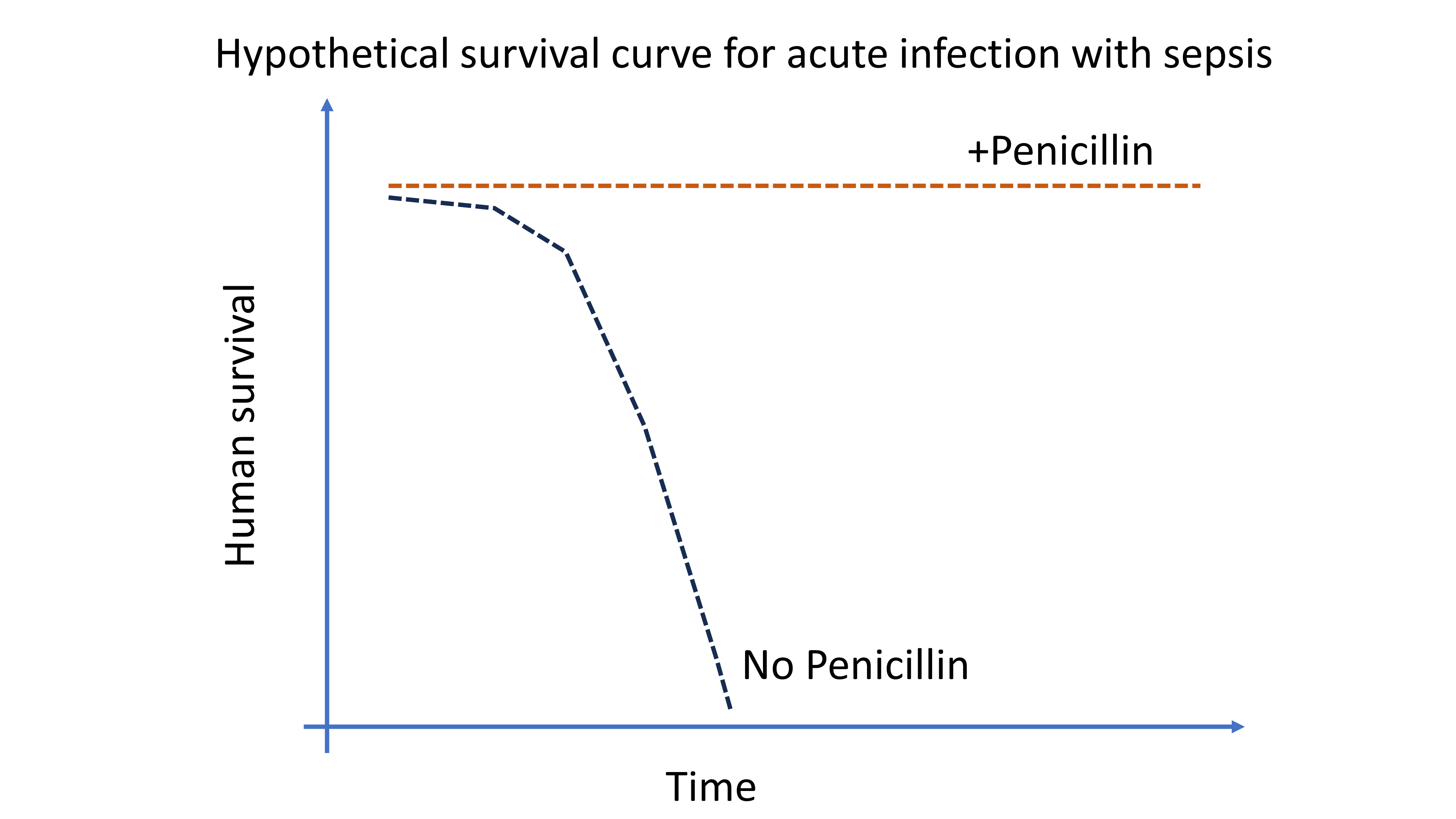 Almost nothing is 100% effective. It’s not like the golden age of penicillin. With some diseases (before drug-resistant bacteria evolved), it was a simple binary: penicillin equals survival, no penicillin equals death. A KM curve for treating a deadly infection with penicillin might have looked like this back in 1955. You don’t really even need to draw the KM curve at all for something like this.