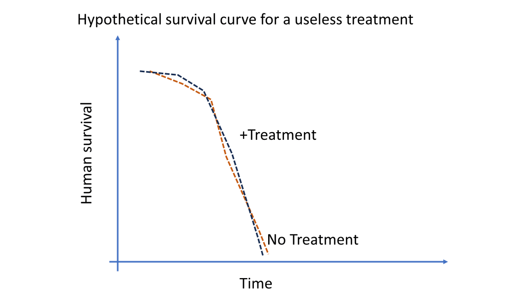 If a drug is useless, the KM curve looks like this: the treated group looks the same or worse than the untreated group.