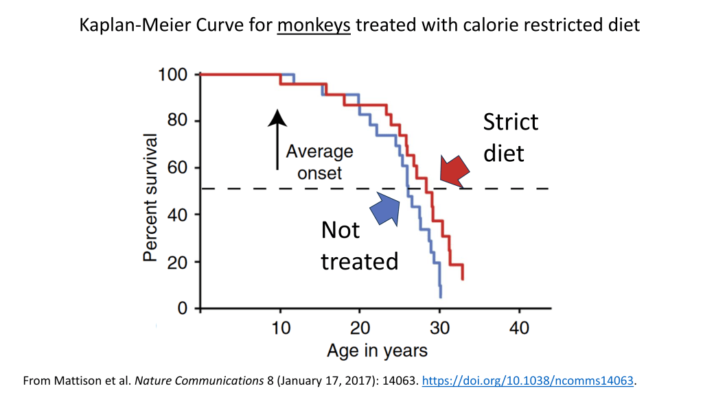 Here’s another KM curve, but this one was for calorie restriction in monkeys. Basically, scientists measure monkey lifespan when they are eating whatever they want compared to monkeys on a pretty strict diet. The low-calorie diet makes a difference!