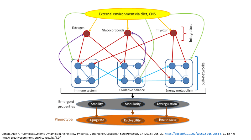 Cohen presents a cartoon version of the very complex webs of interactions that make human biology. We need to model these to understand aging. Because aging is really a change in the emergent properties of these complex systems.