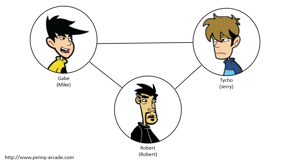 Take Penny Arcade. I’ve been reading the comic for 24 years! It started of as a collaboration between an artist, “Gabe” and a writer, “Tycho.” Between them, they produced something that neither could make on their own. They even made a comic about that when their characters broke up and Gabe made slapstick comics while Tycho wrote weird short stories about anthropomorphic punctuation marks.