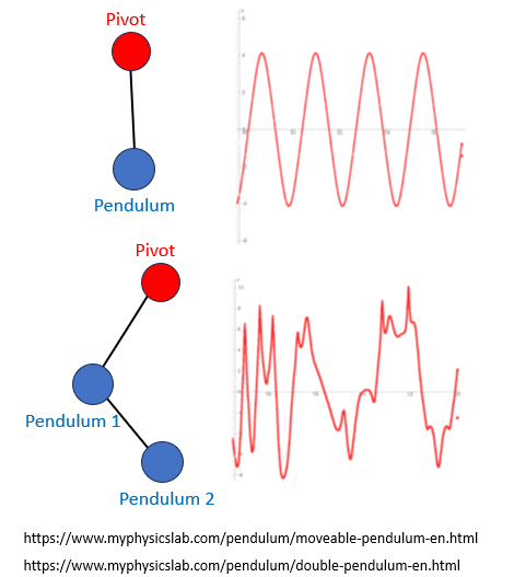 Emergent properties are when you connect things up together and they do new, interesting behaviors. We can see this in really simple systems too. Take a pendulum. It just swings. If you put a shorter pendulum next to it on the pivot, they just swing at different speeds. But if you connect them with a second pendulum connected to the end of the first, you get an non-periodic chaotic motion. The system launches into unpredictable behavior.